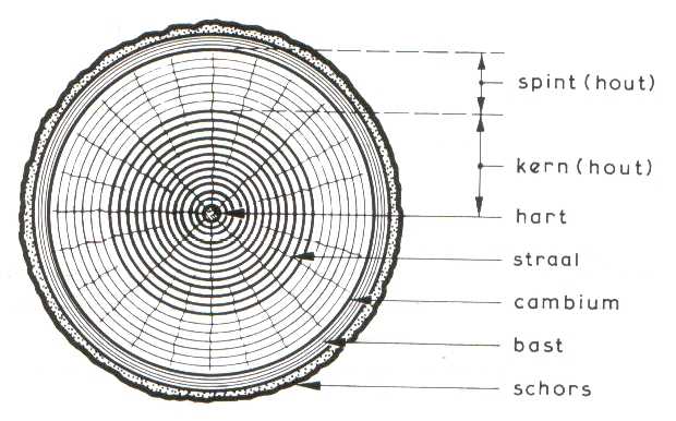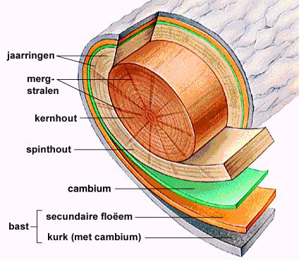 | klik op de afbeeldingen voor groter! jaarringen (groeiringen), houtstralen (mergstralen, soms een spiegel vormend), kernhout, spinthout, cambium en bast in hout met secundaire floëem en kurk (bron pijl en boog): ![]() |