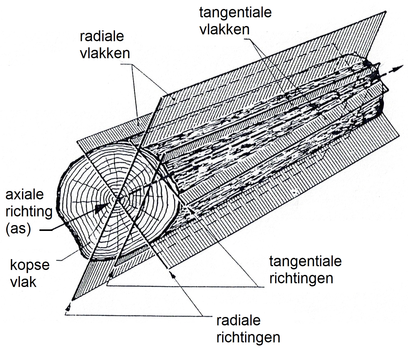 axiale richting (kopse vlak is doorsnede loodrecht op de as van de stam); radiale richting (radiaal vlak is door as van de stam en over de straal van de stam; kwartiers gezaagd hout); tangentiale richting (tangentiaal vlak is evenwijdig aan de jaarringen, niet door de as van de stam; dosse gezaagd hout): ![]() |