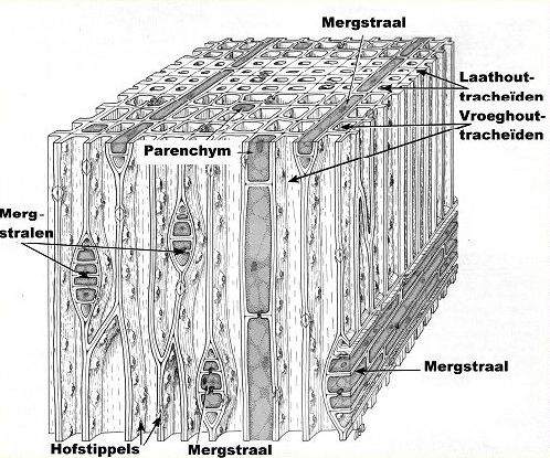 soorten cellen van een conifeer, houtstralen (mergstralen), parenchym, tracheïden, hofstippels (rechterbovenhoek gaat richting midden van de stam): |
