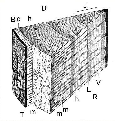 richtingen van doorsneden in hout: axiaal (loodrecht op de as van de stam; ax = as), radiaal (door as van de stam en over de straal van de stam; radius = straal), tangentiaal (loodrecht op de straal, niet door de as van de stam): ![]() |