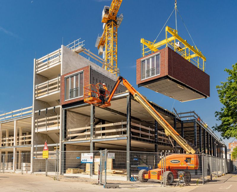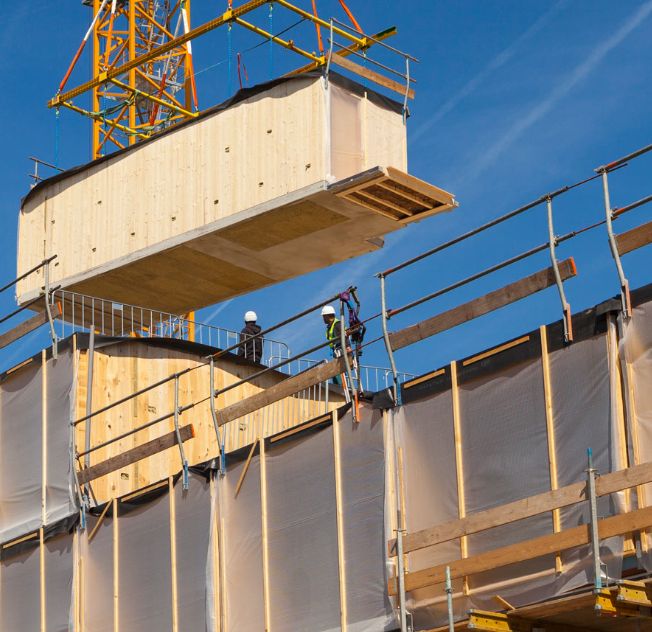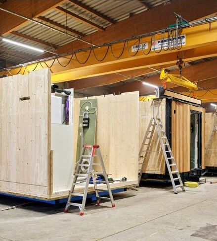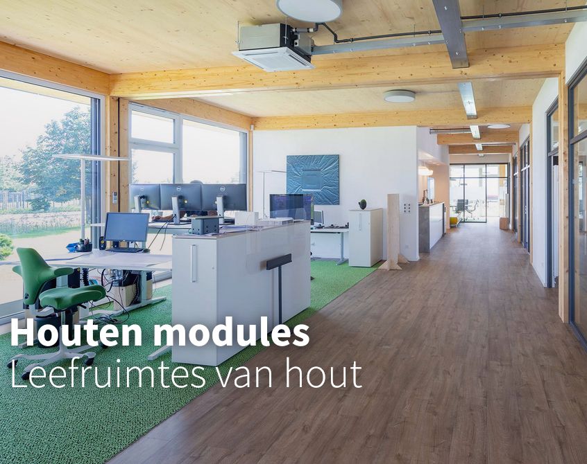 MODULEBOUW modulebouw in hout; "de houten modules worden onder perfecte omstandigheden in fabriek gemaakt en het eindproduct is kant- en-klaar. Dus ook inclusief wc, badkamer, keuken, ramen, deuren, afwerking van vloeren, clt-wanden en plafonds, gevels en daken "(de groot vroomshoop): |