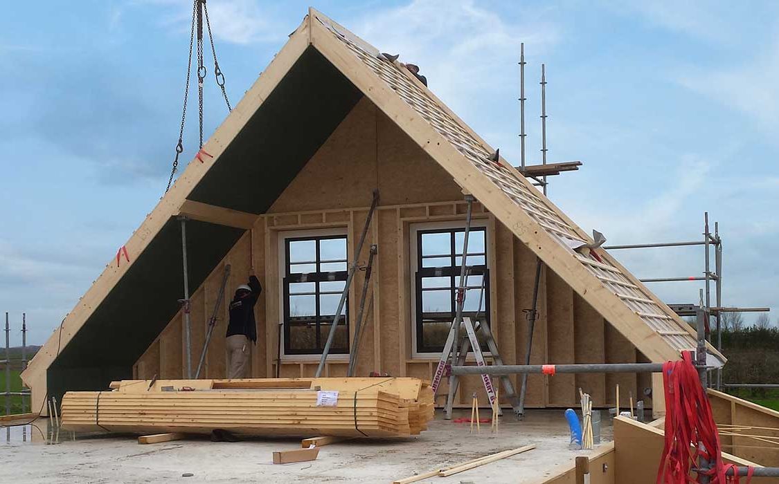 houtbouw met prefab, geïsoleerde wand- en dakpanelen; de isolatie bestaat uit onder druk ingeblazen steico houtvezels (blokiwood van tymberbuildings): ![]() |