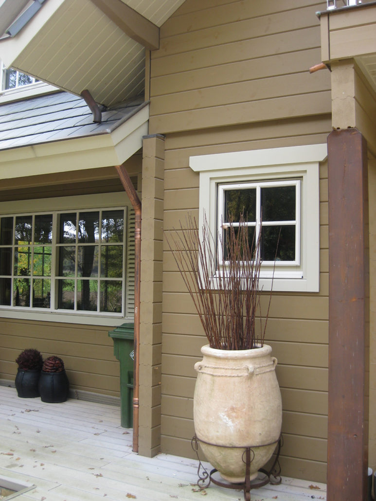- Als buitenspouwblad en gevelafwerking van gebouwen van houtbouw kan voor hout worden gekozen, maar het buitenspouwblad kan ook hetzelfde zijn als bij een andere bouwmethode, bijvoorbeeld baksteen, hout of plaatmateriaal als trespa, keralit, werzalit e.d., of een gepleisterde gevel, of metaal als zink, koper, rvs o.d. (met een ondergrond van watervast multiplex); zie gevelbekleding.