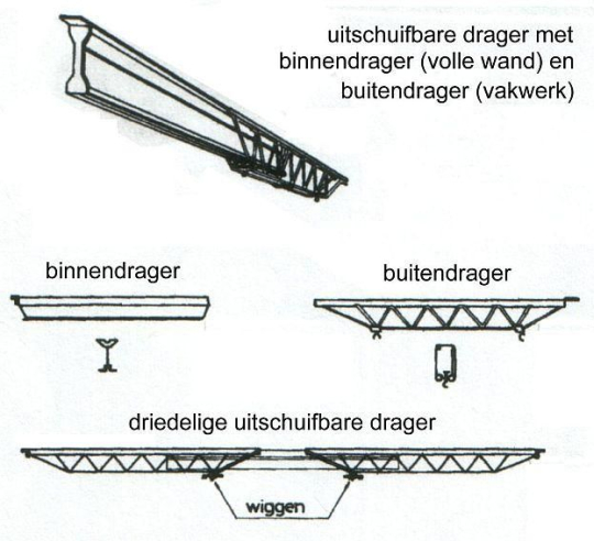 De afbeelding toont de uitschuifbare drager met binnendrager (volle wand) en buitendrager (vakwerk) en een driedelige hünnebeckdrager.