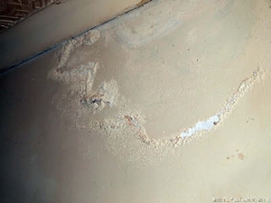 door vocht en hygroscopische zouten aangetast pleisterwerk; klik voor iets groter: ![]() |