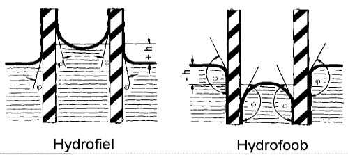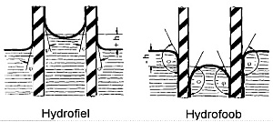 kenmerkende vormen vloeistofspiegel in een capillair bij een hydrofiel en hydrofoob materiaal (klimapedia): ![]() |