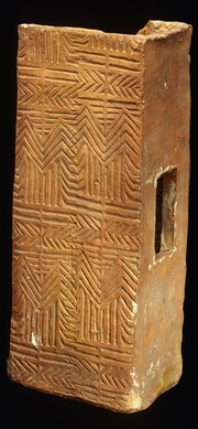 tubulus met ingedrukt patroon om aanhechting te verbeteren met bouwmuur (mortel) en binnenmuur (pleisterlaag); wonderlijk dat het zo'n fraai patroon, terwijl het achter een pleisterlaag verdwijnt... (roman box flue tiles, mudlarking): ![]() |