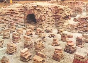 hypocaustum: "op de verdichte aarde werd een 100 mm dikke laag grind uitgespreid, daarna werd een laag grotere stenen gelegd, gevolgd door een 150 mm dikke laag grind gemengd in kalkmortel en afgewerkt met een