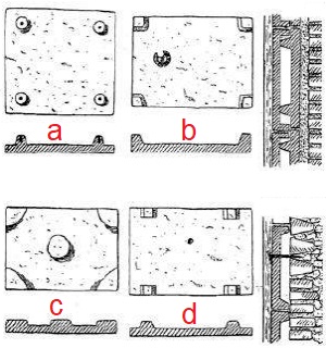 in plaats van holle keramische buizen werd in de beginperiode ook een spouw geschapen door tegels met uitsteeksels toe te passen; twee soorten tegulae mammatae (a, c, d) en een tegula hamata (b); bij de bovenste methode haakt de hamata over de mammata waardoor ook een soort tubulus ontstaat (ingenio-web): ![]() |