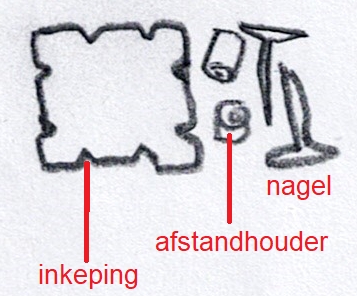 inkepingen aan rand van de tegel (de T-vormige nagel hield gelijktijdig