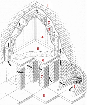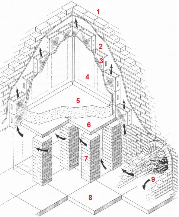 hypocaust, hypocaustum, het principe (rechtsonder is de vuurplaats); in dit geval worden zowel de vloer als de wanden verwarmd; de "voorzetwand" bestaat hier uit gepleisterde gebakken holle kleibuizen, de tegulae tubuli; klik voor groter: ![]() 1 muur (buitenmuur of tussenmuur) 2 pleisterlaag 3 tubuli (holle verwarmingsbuizen) 4 beschilderd stuc of maremeren tegels 5 mortelvloer 6 grote draagtegels (suspensurae) 7 pijlers (pilae) 8 tegelvloer 9 stookoven (praefurnium) |
