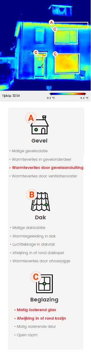 warmtefoto met zichtbaar warmteverlies bij de dakvoet en beglazing; aanbevelingen in rood aangegeven: ![]() |