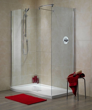 Inloopdouches hebben tegenwoordig vaak één of meer glazen wanden; de