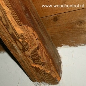Een paar afbeeldingen van het resultaat van schadelijke insecten in hout van Faunacontrol (Woodcontrol):