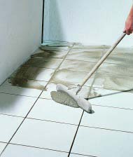 Voorbeeld: na het aanbrengen van tegelwerk wordt de voeg gevuld ("ingewassen") met speciaalvoeg of zilverzandcement en water.