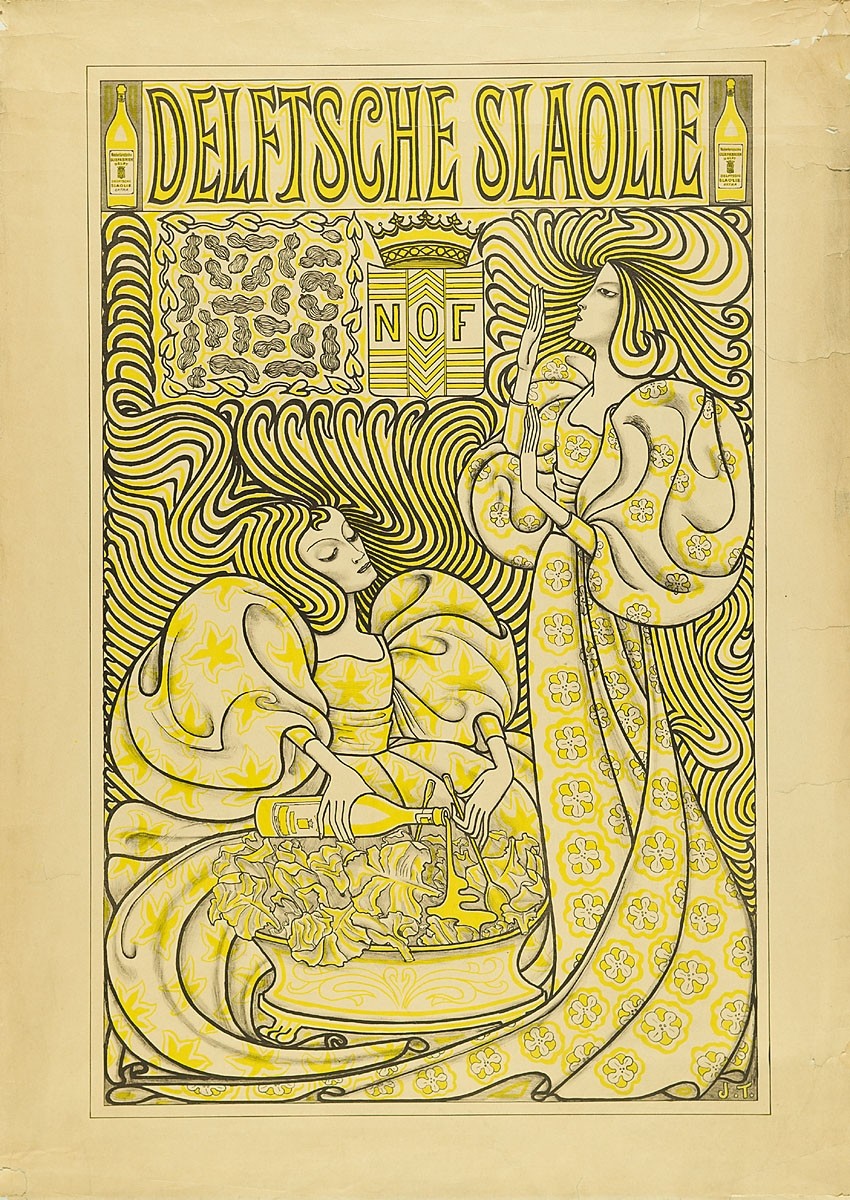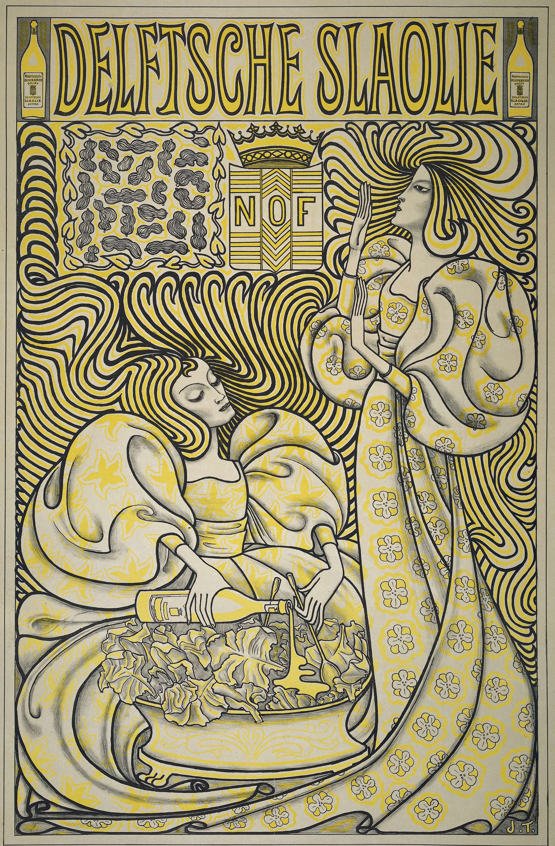 | zweepslagstijl; hoe de wat gestileerde versie van de jugendstil aan haar bijnaam "slaoliestijl" komt; de haren doen ook wel denken aan een japanse stenentuin; tekenaar jan toorop (afbeelding public domain, bron europeana, met dank aan stedelijk museum):  |
