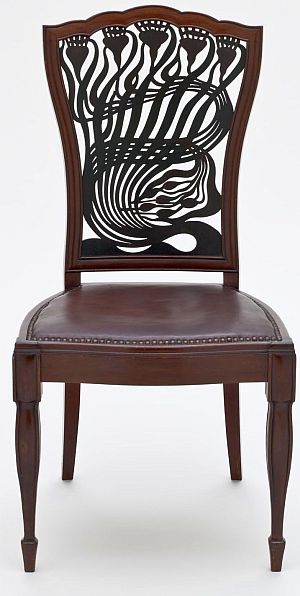 | voorloper jugendstil: stoel lacma van arthur heygate mackmurdo, duidelijke jugendstil-invulling van de rugleuning, terwijl de rest van de stoel nog sober (klassiek) is; ca. 1883 (tentoongesteld in 1885):  |