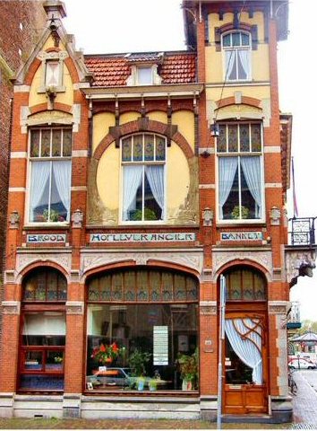 - deze bouwstijl in Nederland over het algemeen iets eenvoudiger en strakker is dan de Franse en Belgische Art Nouveau.