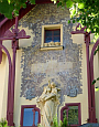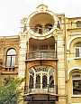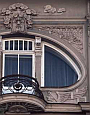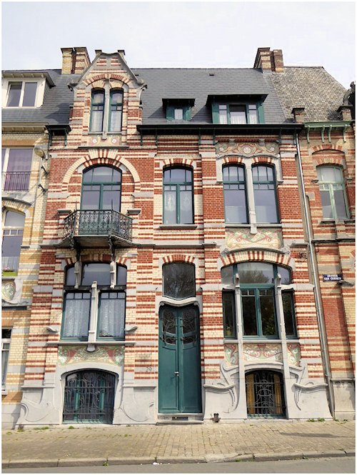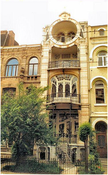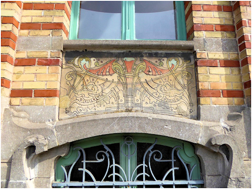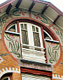 | jugendstil, hôtel ciamberlani, elsene, brussel, arch. paul hankar, 1897; let op ronde bogen rond de ramen en op de gedetailleerde sgraffito; klik voor groter (ben2, wikipedia):  |