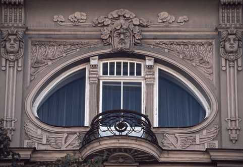 | decoratie over groot deel van de gevel, bijzondere dakondersteuning, praag; klik voor groter! (rondom1900):  |