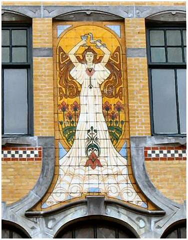 | jugendstil, centraal apotheek leeuwarden, de godin hygaea als symbool voor reinheid, hygiëne (c. messier. wikipedia):  |