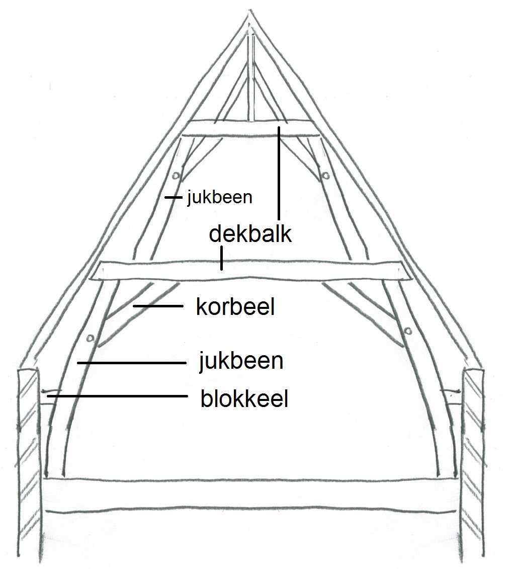 jukkenkap met gestapelde jukken (jukbeen is de schuine stijl, juk of dekbalkjuk is de benaming voor het gebint, dus van de twee jukbenen + jukdekbalk + twee korbeels); klik voor groter: ![]() |