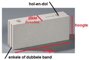 kalkzandsteen blok met benamingen; dikte (breedte), lengte, hoogte, hol-en-dol, enkele of dubbele band (dubbel is klinker kwaliteit): ![]() |