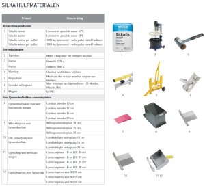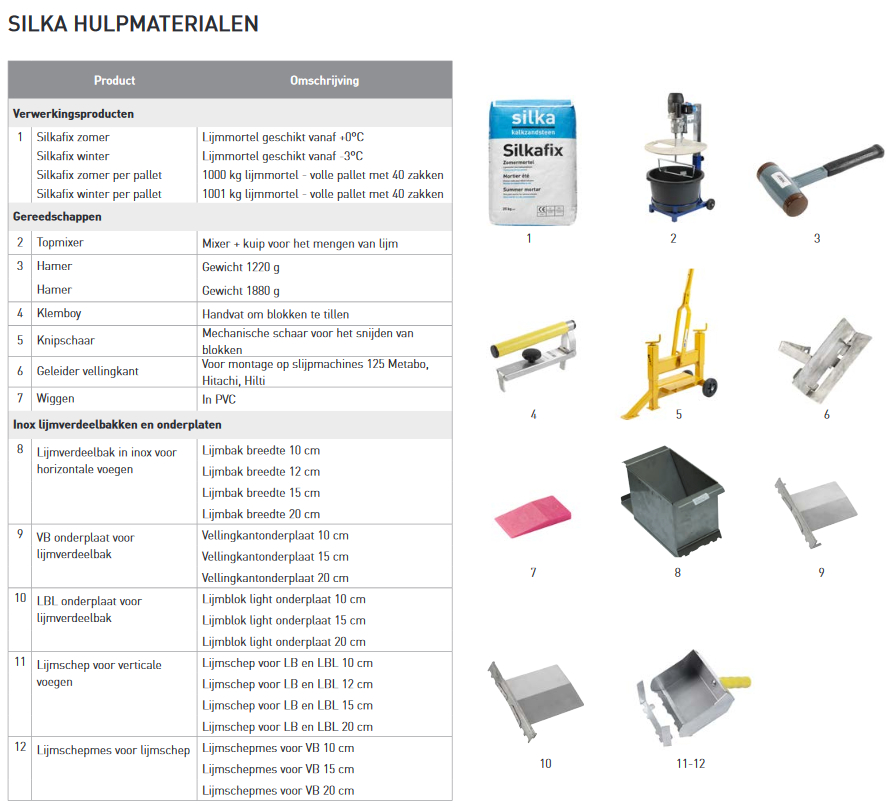 hulpmiddelen bij kalkzandsteen blokken; lijm silkafix, topmixer, hamer, klemboy, knipschaar, geleider vellingkant, wig, lijmverdeelbak (inox) voor horizontale voegen, VB en LBL onderplaten voor lijmverdeelbak, lijmschep voor verticale voegen (LB en LBL), lijmschepmes voor lijmschep (VB); klik voor groter! (silka van xella): ![]() |