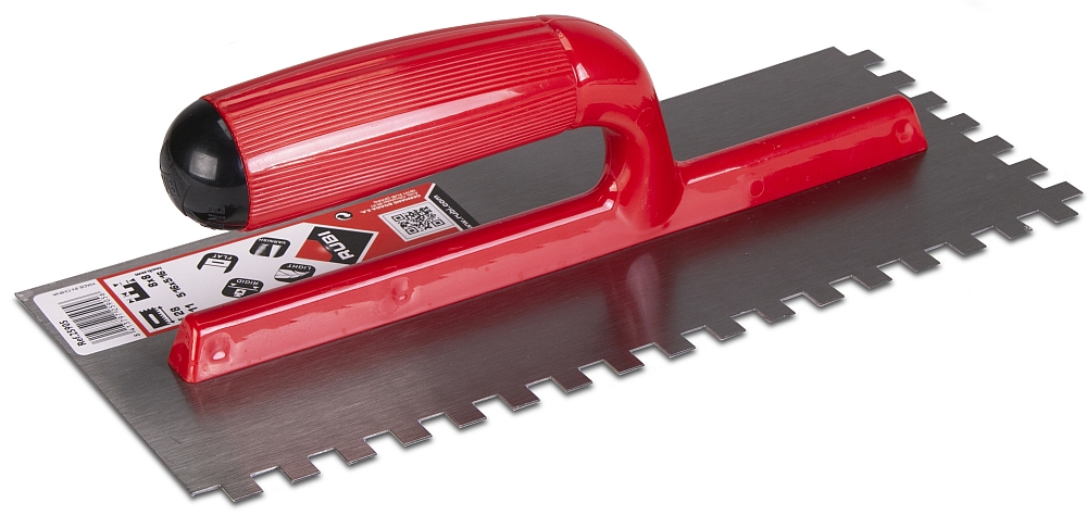 lijmkam van kunststof en met gebogen blad; door de kunststof maakt hij minder geluid en door het gebogen blad is meer lijm mee te nemen; in verschillende vertandingen verkrijgbaar (bouwmaat): ![]() |