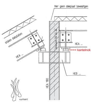 De kantelnok is gelast op een console aan de brandwand. Console, nok, "nokoksel" aan de onderzijde van de ligger en de ligger ter plaatse van de brandwand moeten zo geconstrueerd zijn dat de ligger werkelijk vrij kan kantelen zonder brandwand te beschadigen.
