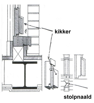 4. Bij naar binnen draaiende houten ramen of deuren is i.v.m. de waterkering de onderdorpel of weldorpel meestal dikker dan de stijlen. Wanneer de ramen of deuren d.m.v. een stolpnaald sluiten worden de verbrede onderdorpels ter plaatse van de stolpnaald voorzien van een over de dorpels vallend aansluitstukje: de kikker.