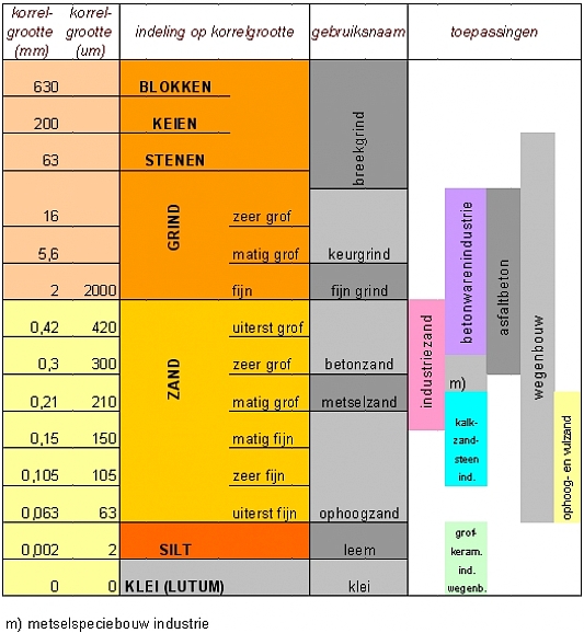 korrelgroottes van klei tot blokken, met benamingen en toepassingsgebieden; klik voor groter: ![]() |