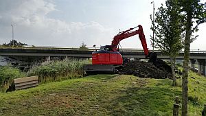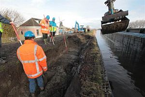 aan de waterzijde wordt tot de kruin van de dijk een 1,5 dikke kleilaag aangebracht over een lengte van 800 meter (cobouw): ![]() |