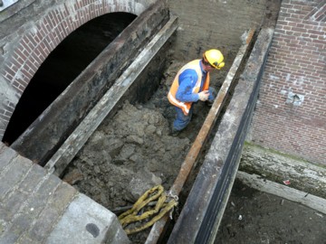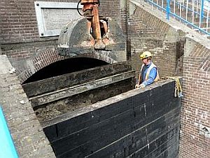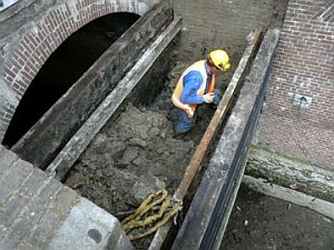 doordringen van water bij een niet meer gebruikte sluis wordt vermeden door het aanbrengen van een kleikist tussen de wanden van de sluis; let op de inkassingen van de balken in de wanden (stichting monstersche sluis): ![]() |