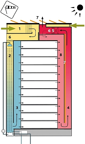 legenda bij de afbeelding: 1 = windvanger (bij luchttoevoer en bij zonneschoorsteen) 2 = klimaatcascade ("warmtewisselaar", onderaan batterij koelen/verwarmen toevoerlucht) 3 = toevoerschacht 4 = zonneschoorsteen (thermiek als drijvende kracht) 5 = wtw-systeem (warmteterugwinning) 6 = hulpventilatoren (i.v.m. flexibiliteit) 7 = locatie zonnepanelen (dak en schacht) 8 = afvoerschacht (afzuigschacht) |