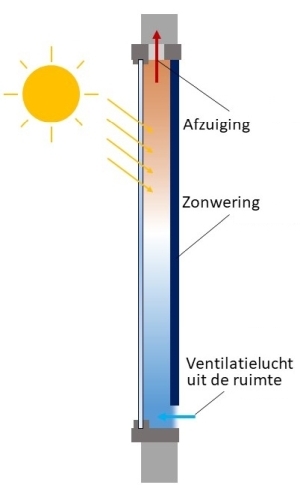 - in de zomer: de lucht in de ruimte erachter wordt via de spouw afgezogen (waardoor minder warmte-ontwikkeling als gevolg van de zonnestraling; meestal zal het afzuigen kunstmatig zijn door een ventilator als onderdeel van de luchtbehandelingskast LBT; in zeer bijzondere gevallen kan het op een natuurlijke manier omdat warme lucht stijgt)