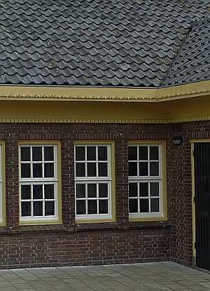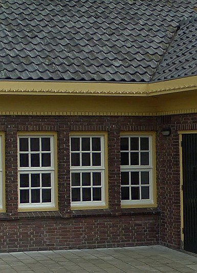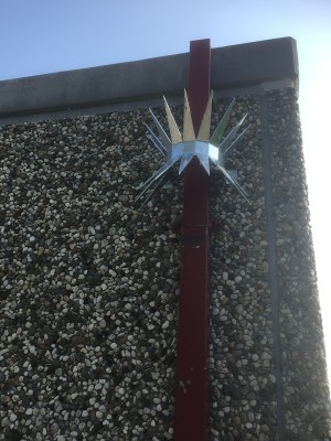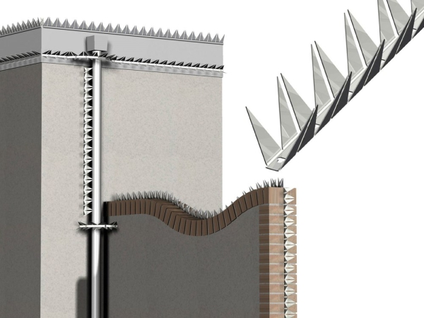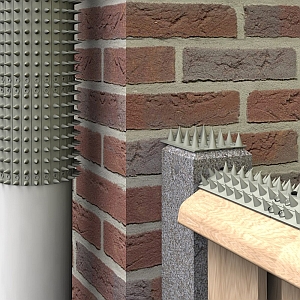 klimbeveiliging bij 't zonnehuis in amsterdam (wellicht ooit aangebracht omdat het gebouw lange tijd heeft leeg gestaan?; de pinnen zitten waarschijnlijk te laag om als vogelwering te dienen dus anti-klim lijkt het doel; de naar boven en onder wijzende, gebogen pinnen passen wel goed bij de tandlijst eronder): ![]() |