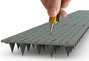 klimbeveiliging, pointstrip, grijs kunststof (polypropyleen, pp) basismaat b*l*h 75*610*17mm, gemakkelijk snijdbaar in juiste formaat en buigbaar,ook golvend toe te passen, montage door spijkers of schroeven (tilmar bouwspecials): ![]() |