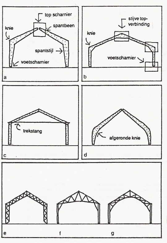 klik op de afbeeldingen voor groter voorbeelden kniespanten in vollewand (met topscharnier, stijve topverbinding, trekstang), afgeronde knie en in vakwerk: ![]() |