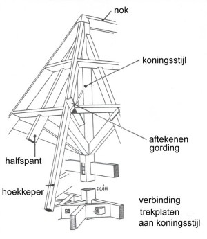 koningsstijl, nok, halfspant, hoekkeper, trekplaten; klik voor groter (boek constructieleer voor de timmerman, s.p. botman, 1953): ![]() |