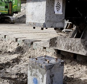koppelpaal; volgende paalsegment gereed om gekoppeld te worden aan het al geheide deel (voorbij funderingstechniek): ![]() |