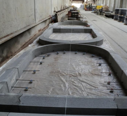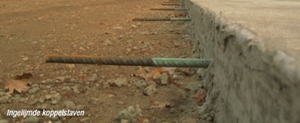 koppelstaven gelijmd in een sluitband (trottoirband) bij een nog te storten deel van de verkeersgeleider: ![]() |