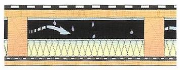 - de dakbedekking van een plat dak maakt het dak aan de buitenzijde dampdicht; omdat de isolatie onder het dakbeschot zit, is het dakbeschot e.d. gevoelig voor temperatuurverschillen en daardoor het risico van condensatie met alle gevolgen (schimmel, rot)