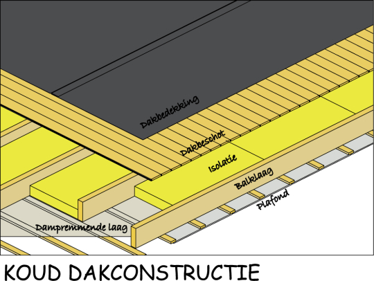 - de dampremmende laag moet aan de warme zijde van de constructie worden aangebracht (zie bij dampscherm), ook hier dus onder de isolatielaag