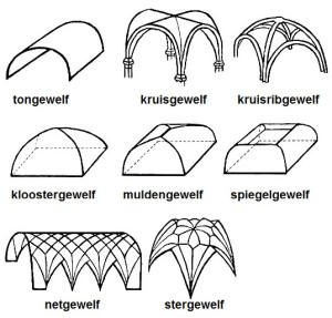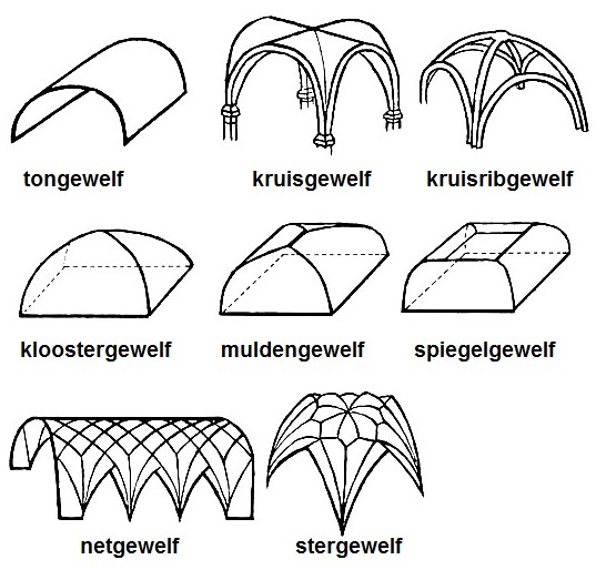 verschillende gewelven: tongewelf, kruisgewelf, kruisribgewelf, kloostergewelf, muldengewelf, spiegelgewelf, netgewelf, stergewelf; klik voor groter: ![]() |
