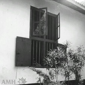 kruisvenster met bovenraam glas-in-lood en onderraam met luiken aan de binnenzijde: ![]() |