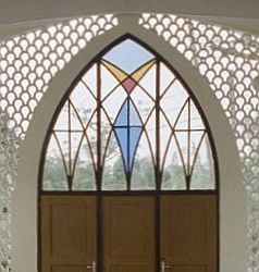 lancetboogjes met fraaie eenvoudige tracering boven ramen en deuren bij de zuiderstadskerk, evangelische broeder gemeente of herrnhutters, paramaribo, suriname; klik voor de volledige afbeelding (universiteit van amsterdam): ![]() |