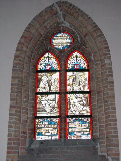 "spitsboogvormig venster met bovenaan een oculus en daaronder twee lancetvensters met gefigureerde glas-in-loodramen, waarvan één opgedragen aan een gesneuvelde militair" (stuivekenskerke, eerste wereldoorlog; onroerend erfgoed belgië):![]() |
