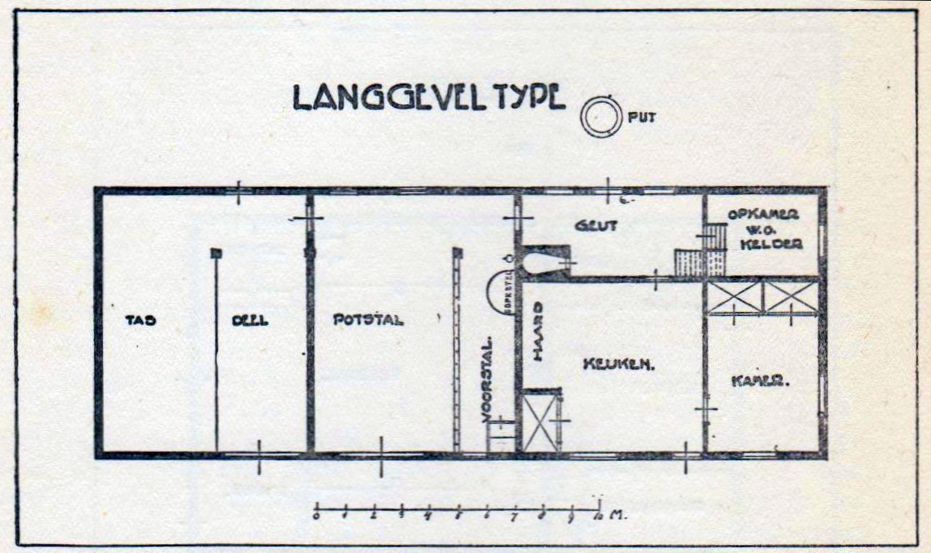 "Vanaf de zeventiende eeuw ontstond in Brabant de behoefte om het woongedeelte, de veestal, de oogstberging en de dorsvloer onder één dak te brengen. Bovendien wilde men de indeling van de stal veranderen en het aantal woonvertrekken uitbreiden. Door dit alles ontstond uit het hallenhuis de langgevelboerderij.