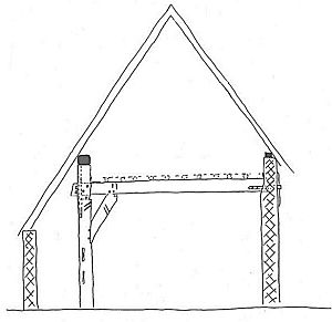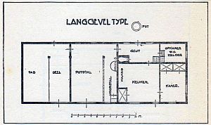 tweebeukige langgevelboerderij; in het lage gedeelte bevindt zich vaak de opkamer met eronder de kelder; in het hogere deel was plaats voor de hoge baander (inrijdeur); klik voor groter (tekening h.j. van houten, met dank aan jan timmers cultuurhistorie): ![]() |